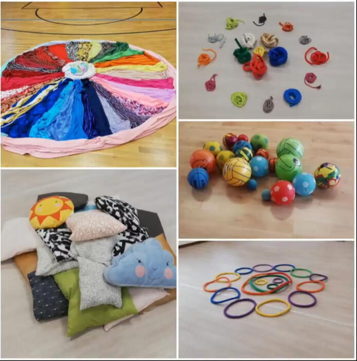 Oggetti semplici e poco strutturati, ideali per favorire la manipolazione e le rappresentazioni simboliche.Tra i materiali a disposizione vi sono palle, cerchi, cuscini, corde, tessuti, scatoloni e molto altro, scelti per offrire al bambino uno spazio di gioco sicuro e creativo.